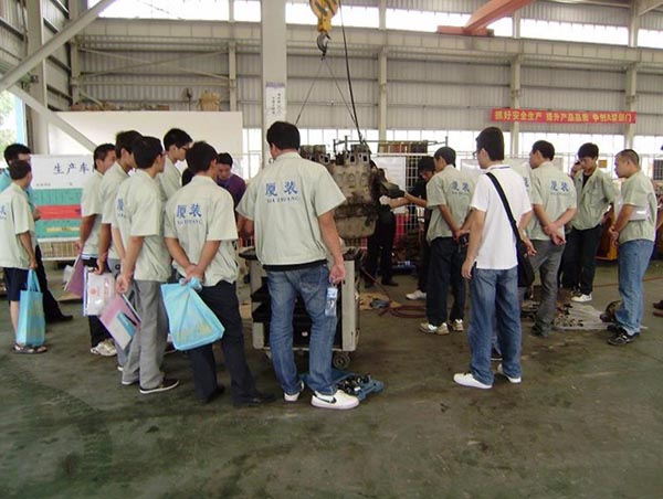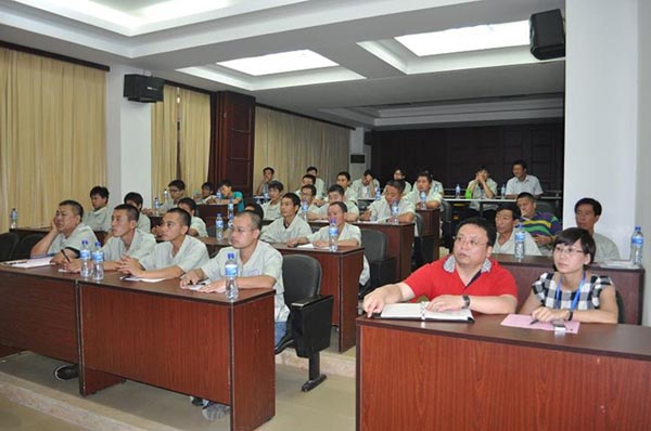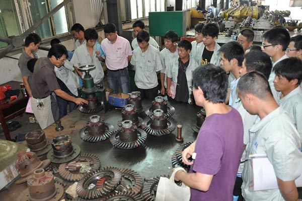 本次研討學(xué)習(xí)班共有來自全國(guó)各地區(qū)共計(jì)40名的一線服務(wù)人員參加。此次學(xué)習(xí)班,引起我司領(lǐng)導(dǎo)高度重視,不僅組織了相關(guān)部門領(lǐng)導(dǎo)系統(tǒng)授課:從新品介紹到各個(gè)機(jī)型的特點(diǎn),從發(fā)動(dòng)機(jī)故障判斷維修到管路液壓件原理介紹,從制動(dòng)系統(tǒng)學(xué)習(xí)到油缸的拆裝;而且與相關(guān)配套廠商協(xié)商,組織全體學(xué)員到相應(yīng)的工廠系統(tǒng)學(xué)習(xí)驅(qū)動(dòng)橋、變速箱、變矩器等主要零配件安裝維護(hù)課程!